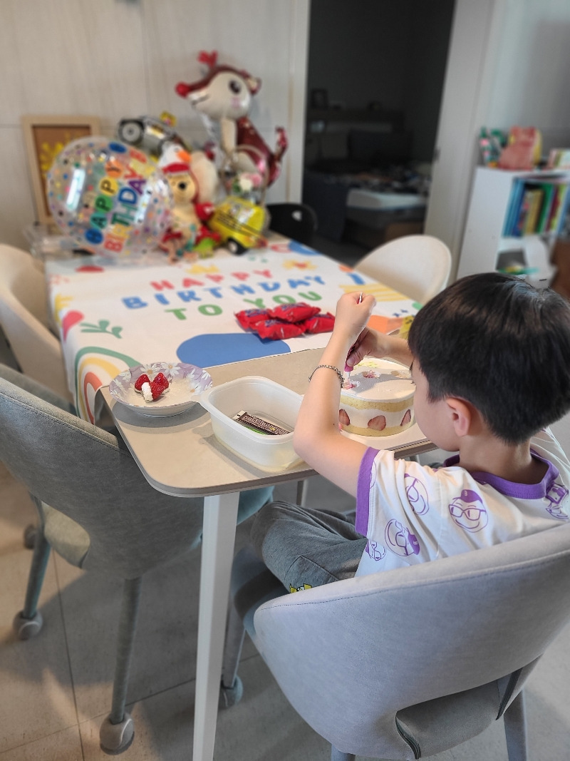 아이 생일은 평일이라 딱히 많은 준비를 한 건 아니고 식탁 한켠만 꾸며 주었다. 집에 오며 케이크를 같이 사는데 본인이 꾸미겠다고 하여 최대한 꾸며지지 않은 케이크를 사서 초콜렛과 젤리 등으로 장식하고는 세상 뿌듯하게 사진도 찍었다. 도넛 케이크도 먹고 싶다고 해서 급하게 빵집서 도넛을 이것 저것 사서 쌓아 주었다.