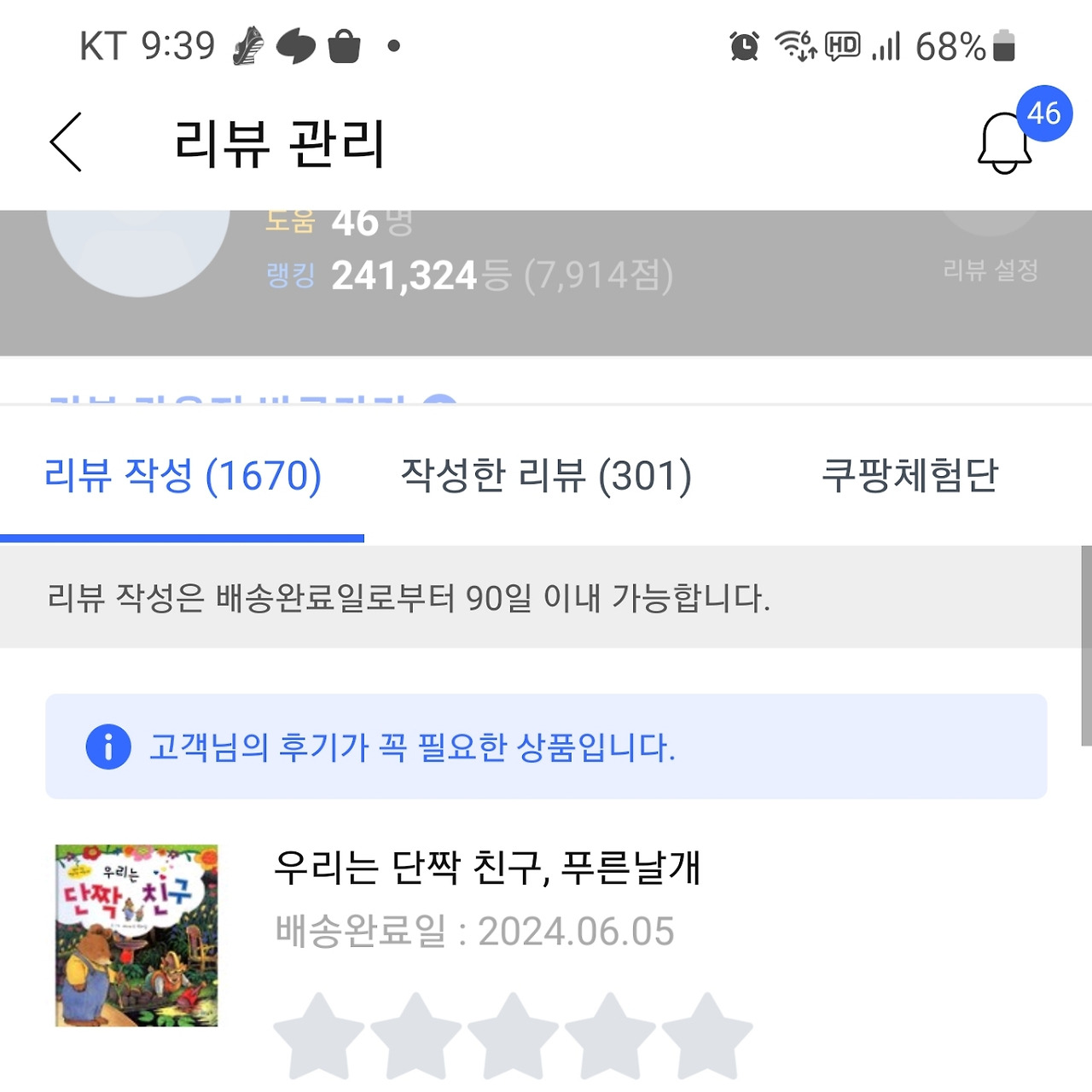 쿠팡체험단으로 요번에 딱 물티슈가 떨어졌는데 마침 있길래 0원 구매 완료했다. 이득이득꿀이득~. 스펙을 말해보자면 46명에게 리뷰가 도움이 됐다고 한다. 랭킹은 24만등. 나는 별점리뷰만 할 때도 있고 네다섯줄 간략하게 쓰는 편인데 도움이 될 때도 있나보다.