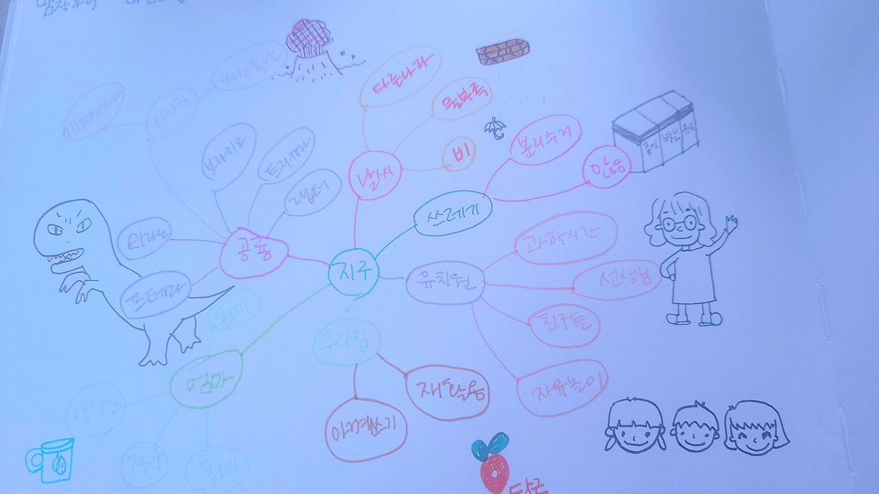 글쓰기 연습을 조금 해 보고 이제 나만의 동화책을 만들어 본다고 하여 소재를 정하기로 했다. 어떤 소재건 상관 없이 생각나는 단어를 쓰고 확장을 시켜 나가는 것이다. 단어로 글로 쓰면서 그림도 그리고 하며 주제를 정해 갔다.