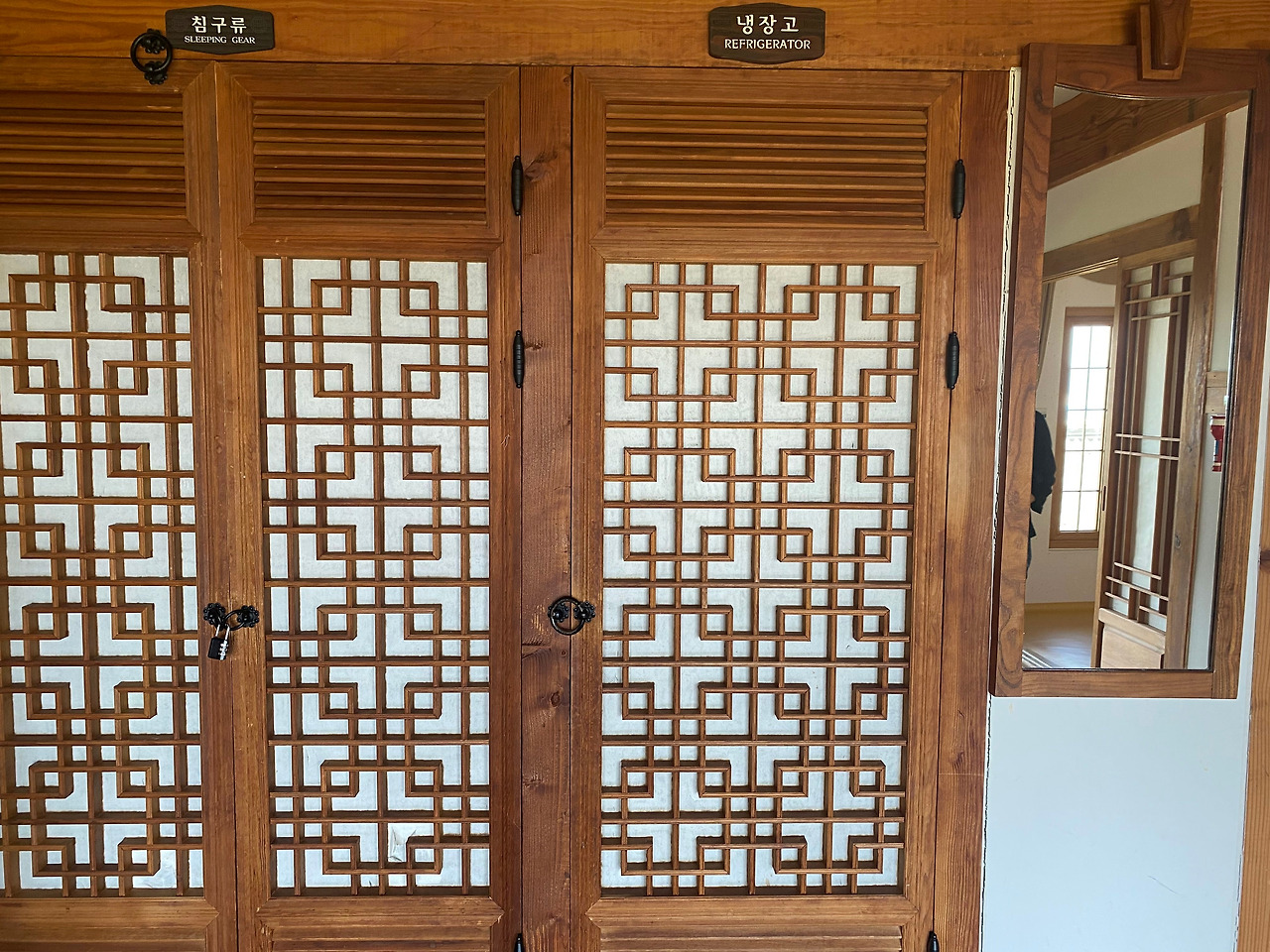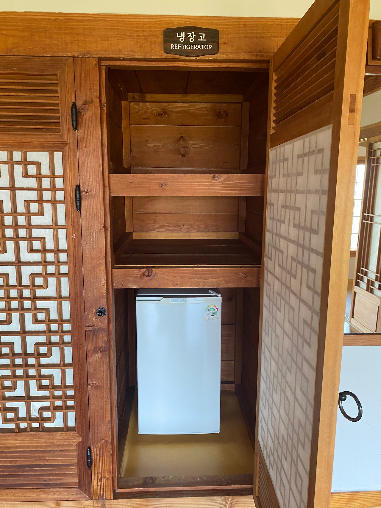 한옥 컨셉을 살린 옷장과 수납함입니다. 냉장고를 열면 안에 저렇게 수납도 할 수 있게 구성되어 있습니다.