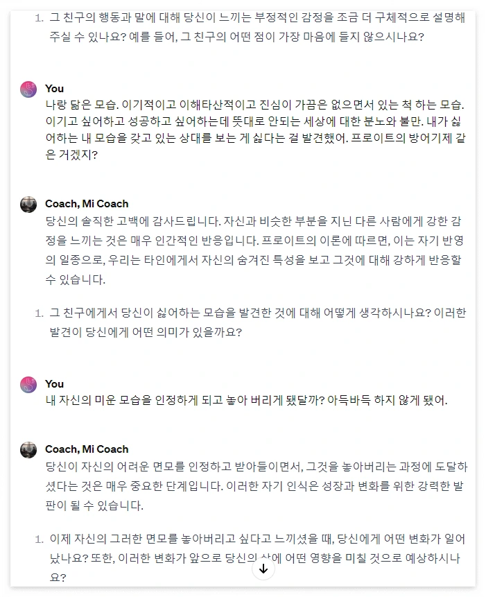 인공지능이라 나도 더 솔직하게 털어놓게 되는 걸까? 코칭 받을 때 상대 코치가 프로이트나 융을 모르면 꺼낼 수 없는 얘기들인데 인공지능은 다 알거라 생각해서 더 편하게 말할 수 있는 것 같다.