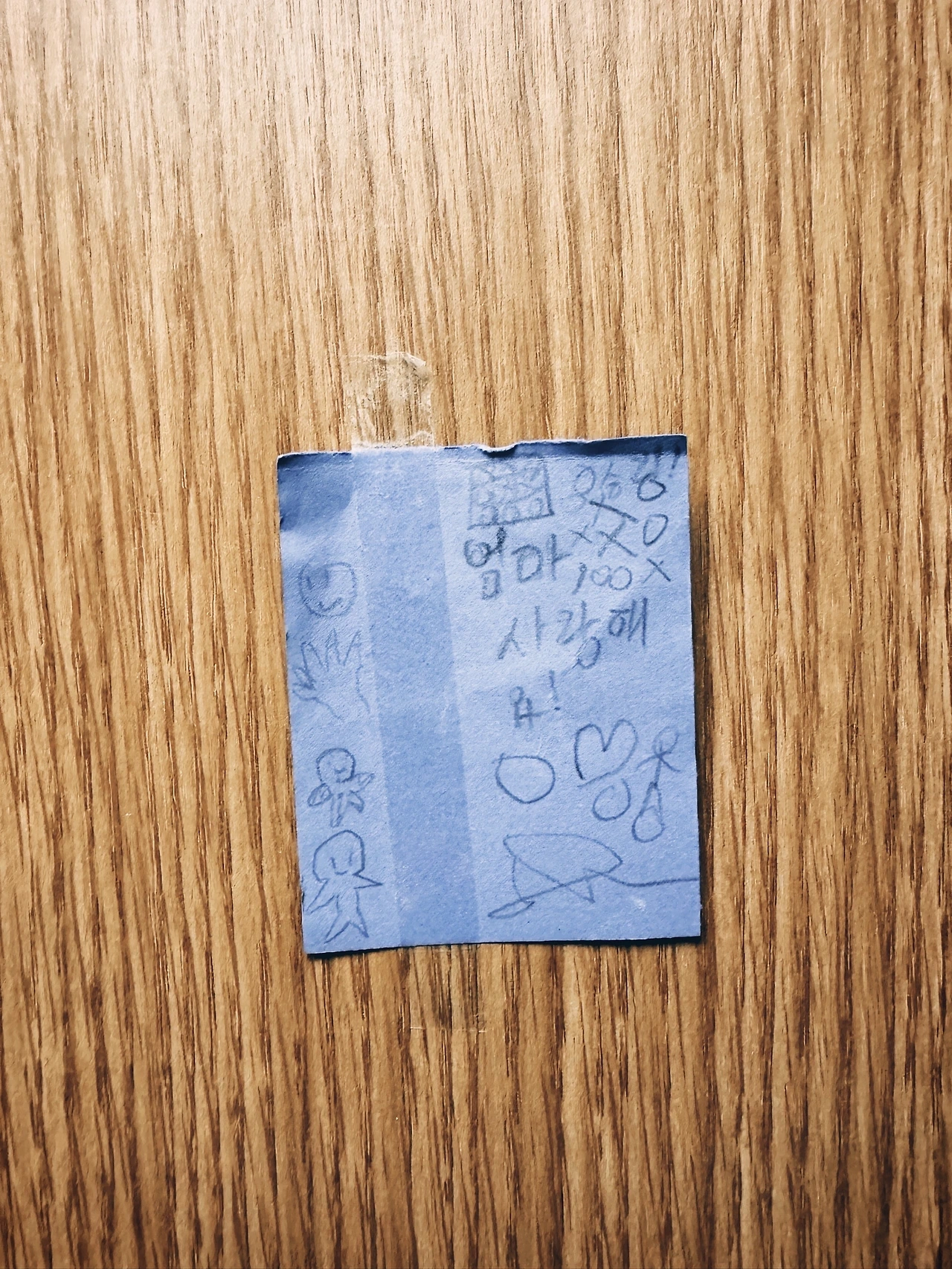 화장대 한쪽 벽에 붙여진 작은 쪽지.