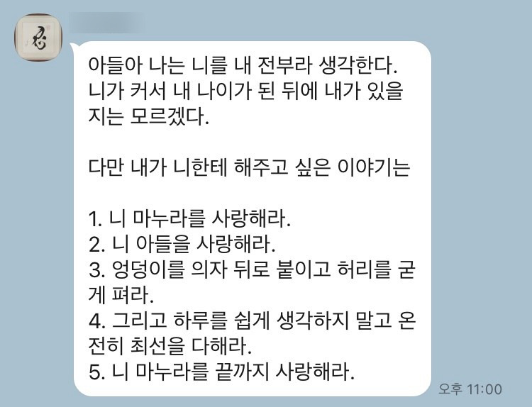 거슬러 때는 2022년 12월 12일경 밤, 거하게 취한 남편은 톡으로 메시지 하나를 보내왔다. 다시 읽어도 코끝이 시큰거리는 그것을 아이에게 바로 보여주지 못했다. 시간이 너무 늦었고 아이는 아빠를 기다리다 잠이 들었다. 아이를 대신해 나는 아빠의 글에 한동안 멈춰 있었다. 그리고 그 순간 김동률의 '취중진담'이 들려왔다.