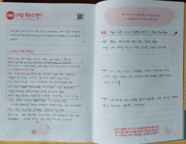 아이는 아빠에게 본인이 글공부로 하고 있는 글쓰기 책 하나를 주고 글 한편을 쓰게 했다. 글쓰기 책에 제시되어 있는 주제 하나를 아빠는 직접 골랐고, 10분의 시간이 주어지고 아빠는 제한 시간을 넘기며 글 하나를 완성했다. 최대한 정성 들여 연필을 꾹꾹 눌러가며 한 땀 한 땀 글을 써 내려갔고, 아빠는 그 글을 아이에게 자신의 목소리로 직접 들려주었다. 한 문단이 다 끝나지 않았음에도 아이는 두 눈이 벌겋게 달아오르기 시작했다. 그럼에도 아빠는 자신의 글을 끝까지 정성 들여 읽어 내려갔고, 마지막 문장을 다 읊고 나서야 아이의 눈물을 안아주었다.