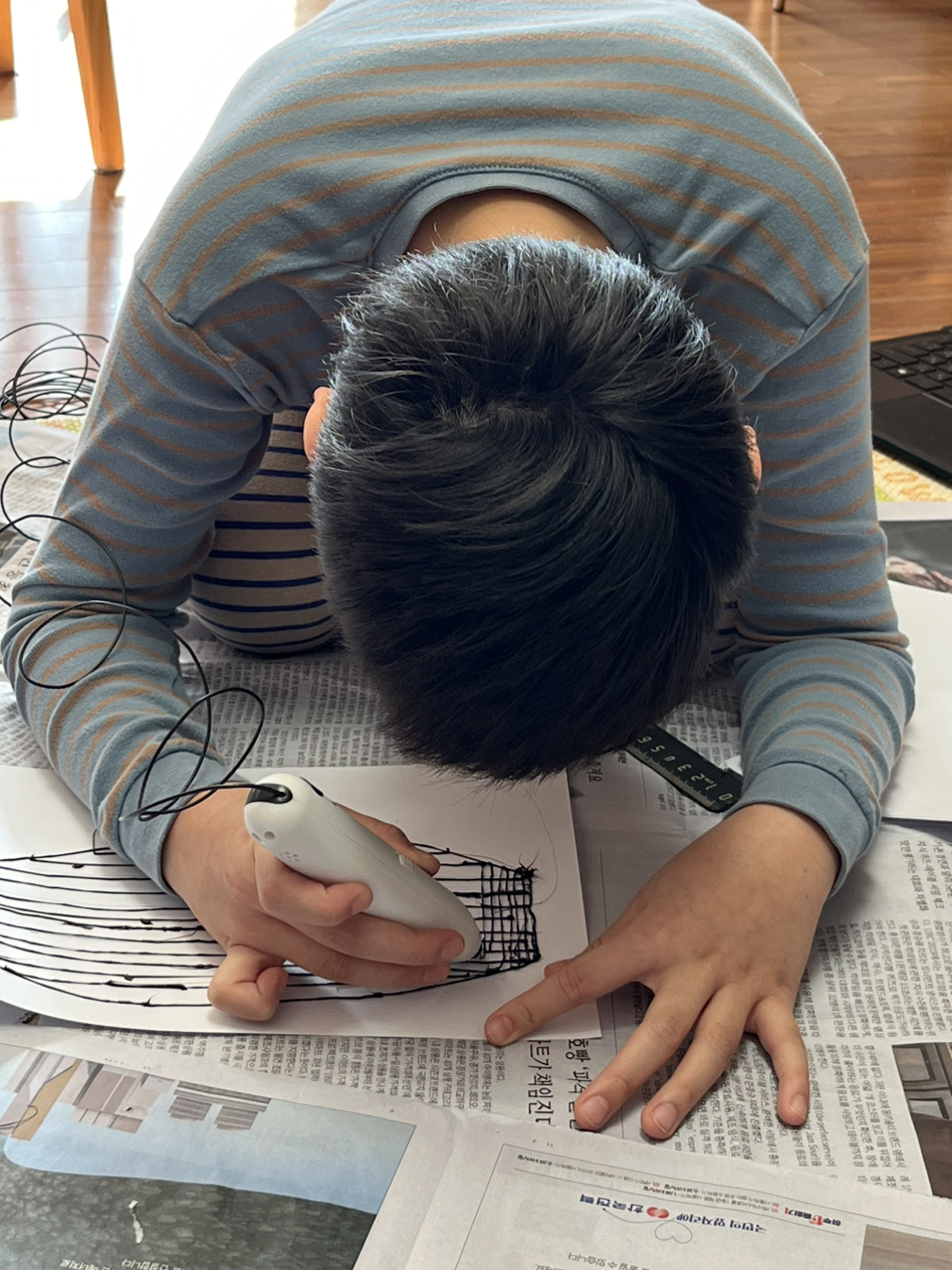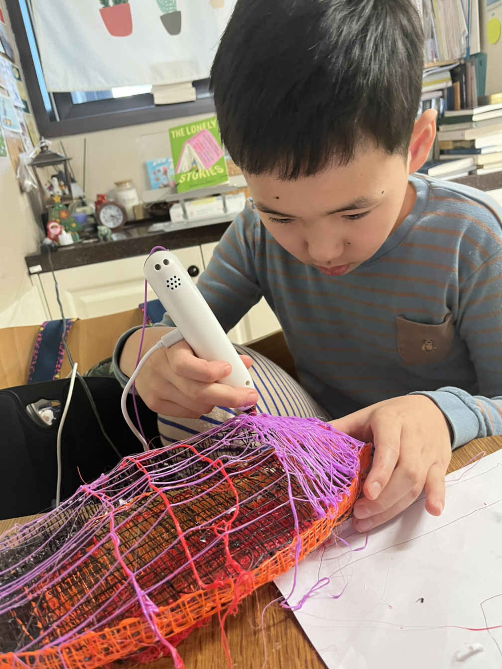 5시간을 한 자리에 앉아 거북선의 뼈대를 조형하고 있는 장인 한 사람. 이 아이는 정말 지(자기) 좋은 거 해야 한다. 아이의 엉덩이를 무겁게 하는 방법은 아이 지 좋은 거 찾아주는 것. 하라 하면 절대 하지 않을 이 아이, 본인 스스로 할라치면 물불 가리지 않을 이 아이. 아이의 머리에는 멋지게 완성될 거북선이 둥둥 떠다니고, 만들어지고 있는 내 앞의 거북선 뼈대는 뭔가 모르게 영상 속과 달라 보이지만, 그럼에도 유토로 뼈대 위를 덮으면 된다는 생각에 3d 펜을 열심히 움직였다. 엄마의 직감은 대부분 빗나가지 않는다. 영상 속 전문가의 3d 펜과 어린이용 3d 펜이 좀 달라 보인다는 사실을 알면서도 내심 모르는 척했다. 환상으로 가득 차 있는 아이에게 옆에서 뭐라 뭐라 하는 것은 엄마의 잔소리나 개입으로 밖에 느껴지지 않을 것이다. 눈을 질끈 감고 못 본 척 모르는 척 바쁜 척하는 나란 엄마.