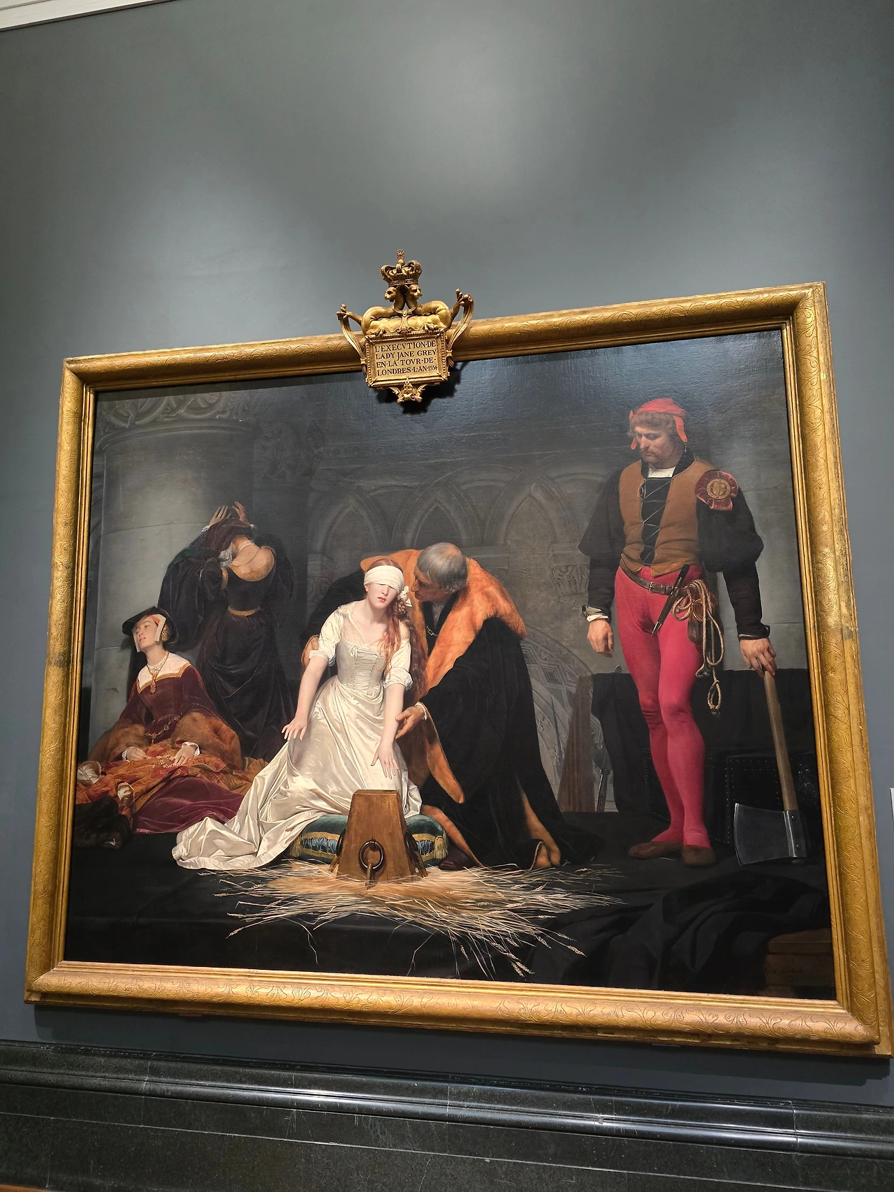 갤러리에서 나가기 전에 우리 시선을 끌었던 마지막 그림, 폴 들라로슈의 '제인 그레이의 처형'. 이 그림은 크기만으로도 공간을 압도했다. 굳이 제목을 보지 않아도 처형을 막 앞둔 장면 같았고, 순백의 드레스를 입은 한 여인이 하얀 천으로 눈이 가려진 채 더듬거리는 듯한 두 손이 보는 이에게 안타까움을 더했다. 아이는 흔들리는 눈동자로 이 그림에 시선을 거두지 못했다. 슬픈 역사적 사실이 그림 속에 그려져 있겠지만 배경을 모르더라도 이 그림은 충분히 우리들의 마음을 아리게 했다.