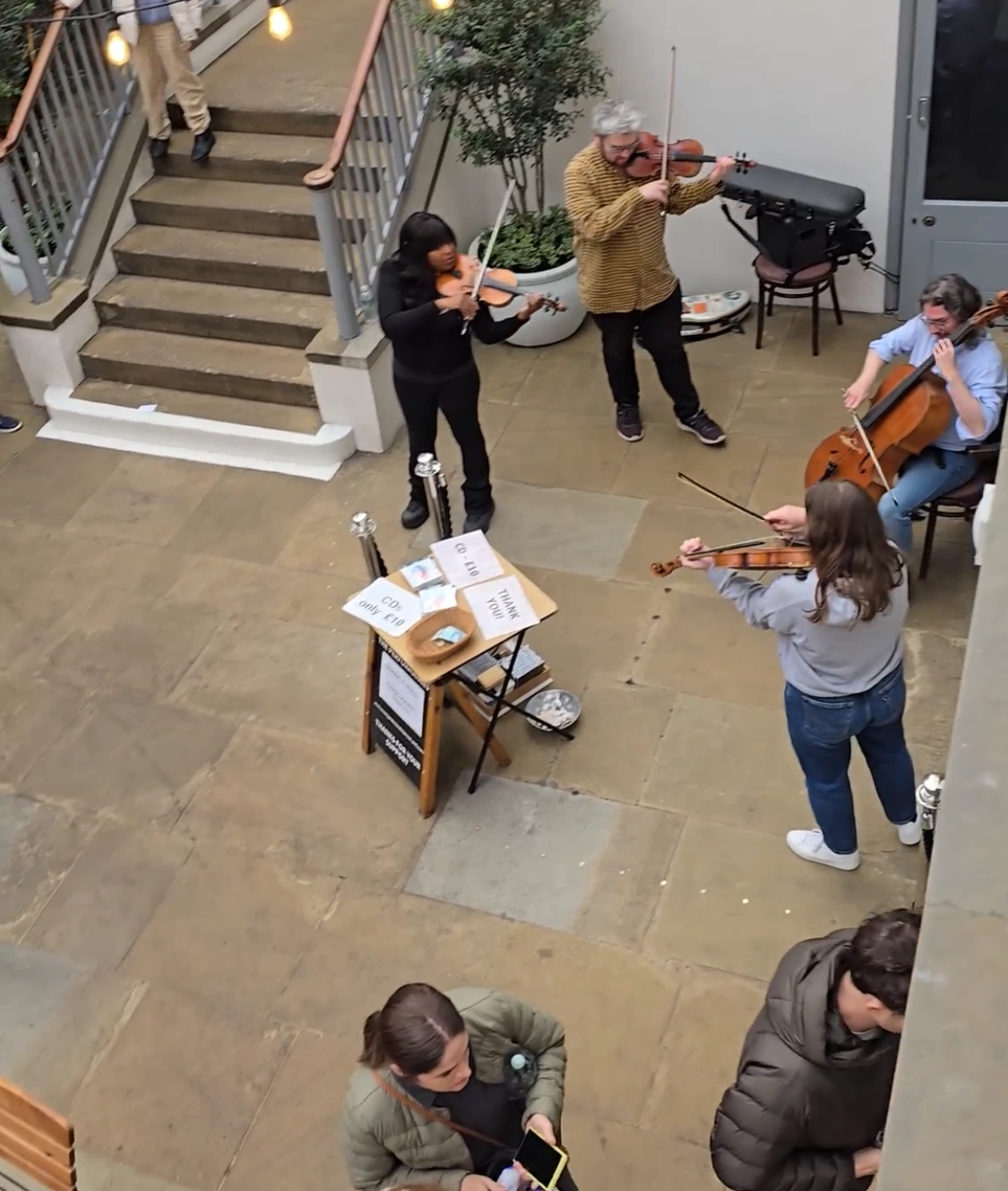 자유 일정의 시작 장소, 코벤트 가든으로 다시 왔더니 작별인사를 했다고 생각했던 런던이 다시 인사를 하는 기분이었다. 유료 화장실 옆 중정에서 음악 연주가 한창이었다. 바이올린과 첼로 4중주. 흑인 연주자가 메인이라며 아이는 유심히 그녀의 연주를 지켜보았다. 심지어 아이가 가장 즐겨 듣는 곡, '캐리비안의 해적 ost'를 연주하는데, 아이는 박수로 환호했다. 바이올린을 배우기 시작한 지 반년이 넘은 아이가 느끼는 그들의 연주는 사뭇 다를 듯했다. 연신 와와를 외치는 아이의 모습에 남편은 마지막 남은 동전 5파운드를 그들에게 기부했다.
