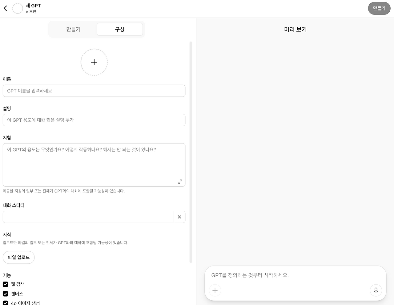 GPT 만들기 탭에서 직접 구성하거나