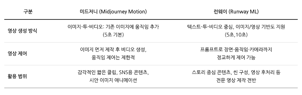 Midjourney는 ‘움직이는 그림’에 가깝다면 Runway는 훨씬 더 정교한 장면 설계와 카메라 제어가 가능해요!
