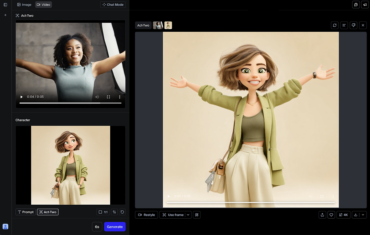 Act-Two는 움직이는 퍼포먼스 비디오만으로 얼굴, 머리, 손, 몸 전체의 디테일한 움직임과 표정, 심지어 음성까지, 그 움직임을 입히고 싶은 캐릭터에 그대로 적용할 수 있는 AI 모션 캡처 기능이에요!