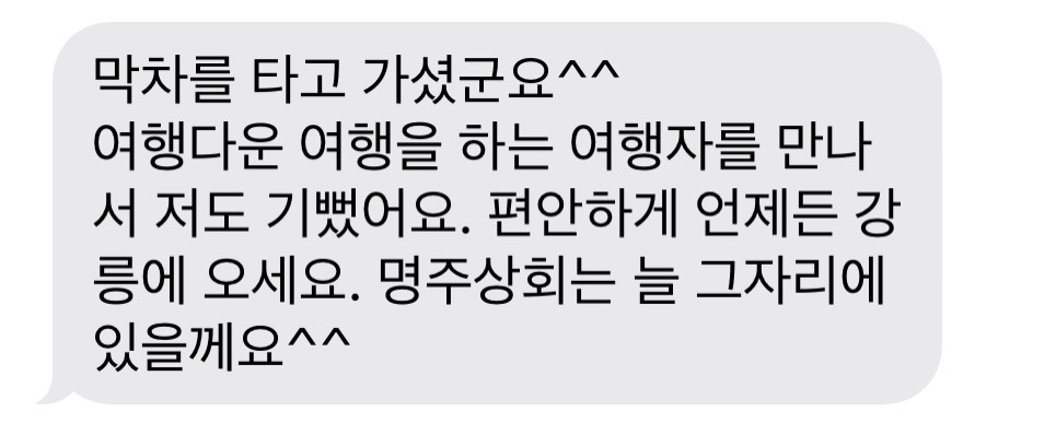 다음날 기차를 타서 명주상회 사장님께 문자를 드렸더니 따뜻한 미소를 보내주셨다. 명주상회 공간과 이곳에서 만난 사람들을 나는 선물같이 오래 기억할 것이고 조만간 또 방문하게 될 것 같다.
