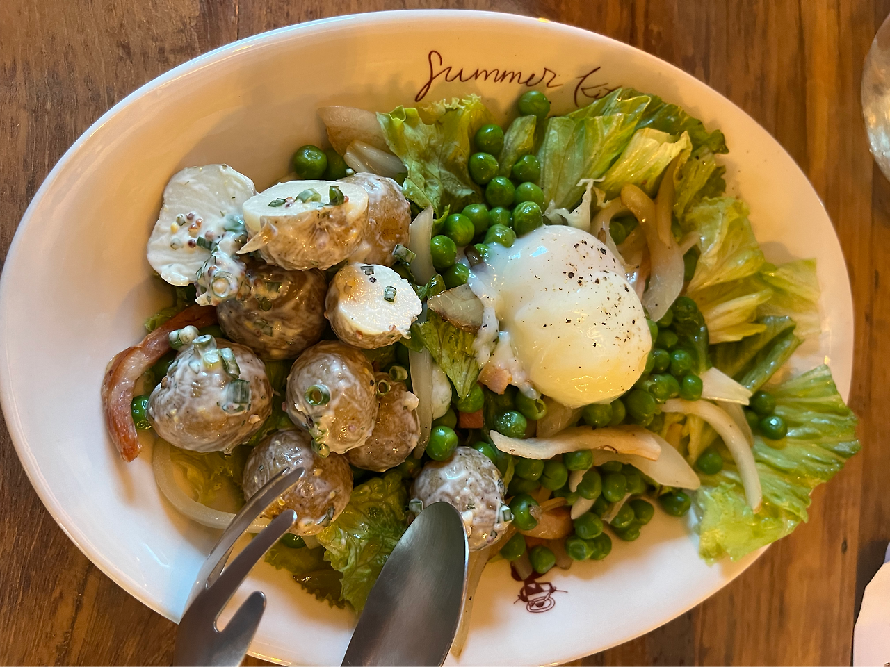 내가 좋아하는 어니언수프는 미소가 절로 지어질 만큼 맛있고 달콤했다. 비프부르기뇽의 소스와 같이 곁들여진 야채도 맛있어서 소스를 남김없이 먹었다. 가장 맛있었던 건 샐러드였는데 따뜻한 샐러드를 기대하지 않았는데 양상추를 휘리릭 따뜻하게 조리한 것은 처음이라 색다르고 맛있었다. 완두콩, 베이컨 등 식재료의 조합도 아주 훌륭했다.
