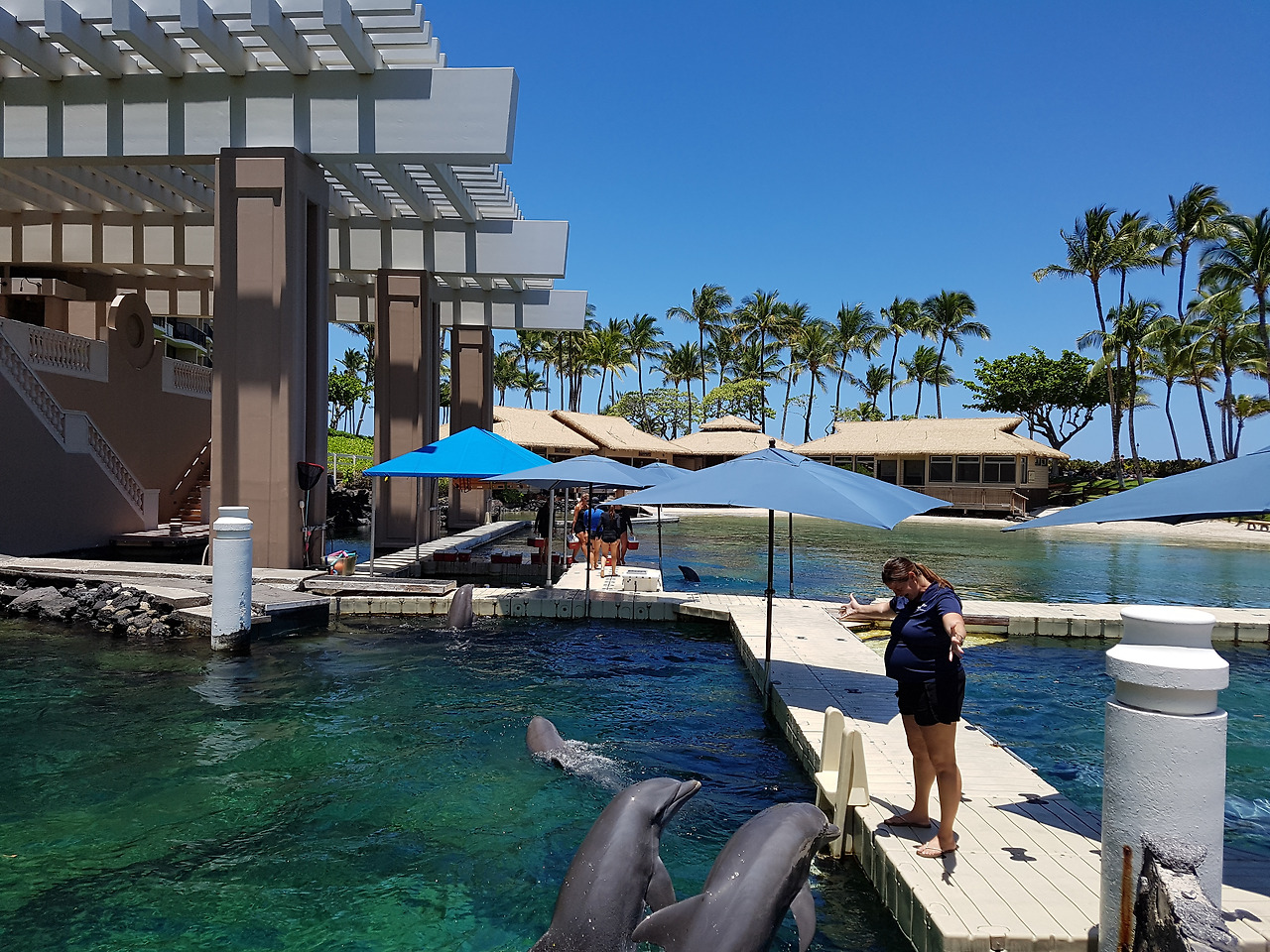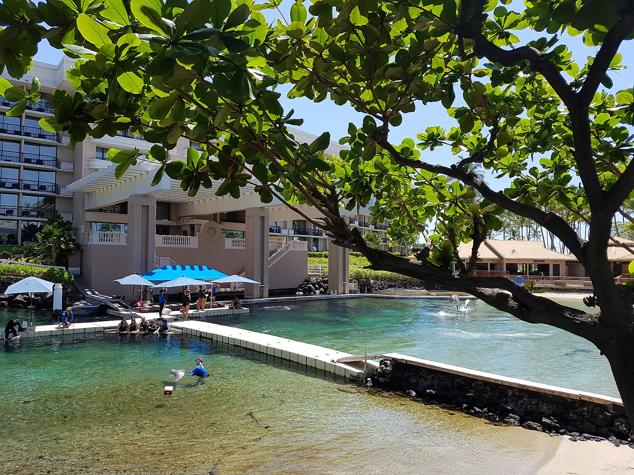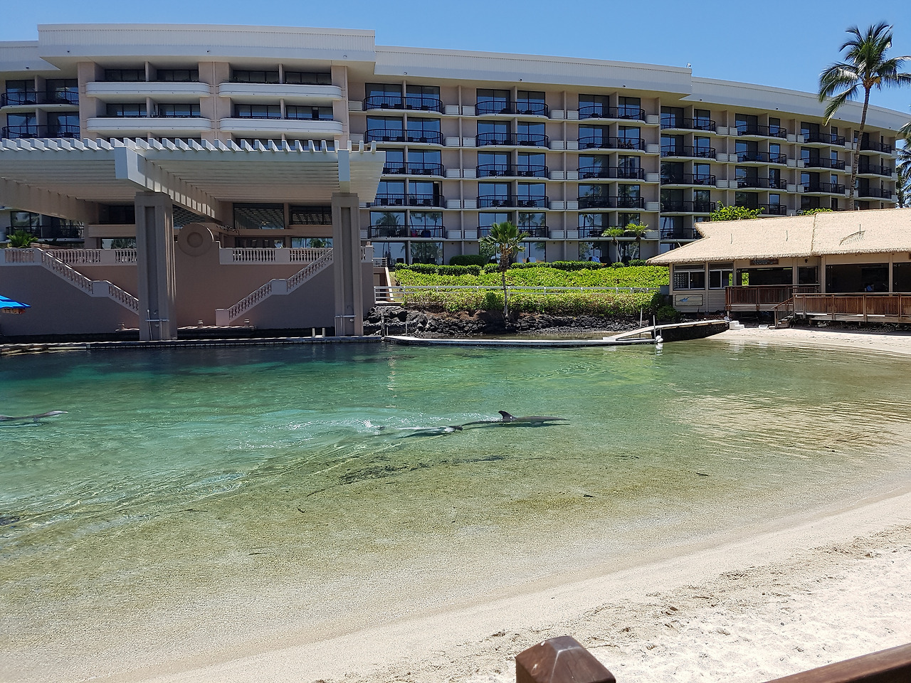 우리가 있던 힐튼 와이콜로아 빌리지는 총 25만 평방미터 부지에 몇 개의 호텔과 리조트가 있는 거대한 리조트 단지다. 리조트 안에 보트와 긴 트램이 다니고 그 정류장이 몇 개가 될 정도로 크고 광활하다. 4개의 수영장은 하나하나가 웬만한 리조트보다 더 큰 수준인 데다 돌고래가 있는 풀장도 있고 수영장 옆으론 마찬가지로 광활한 태평양 바다가 펼쳐져 있다.