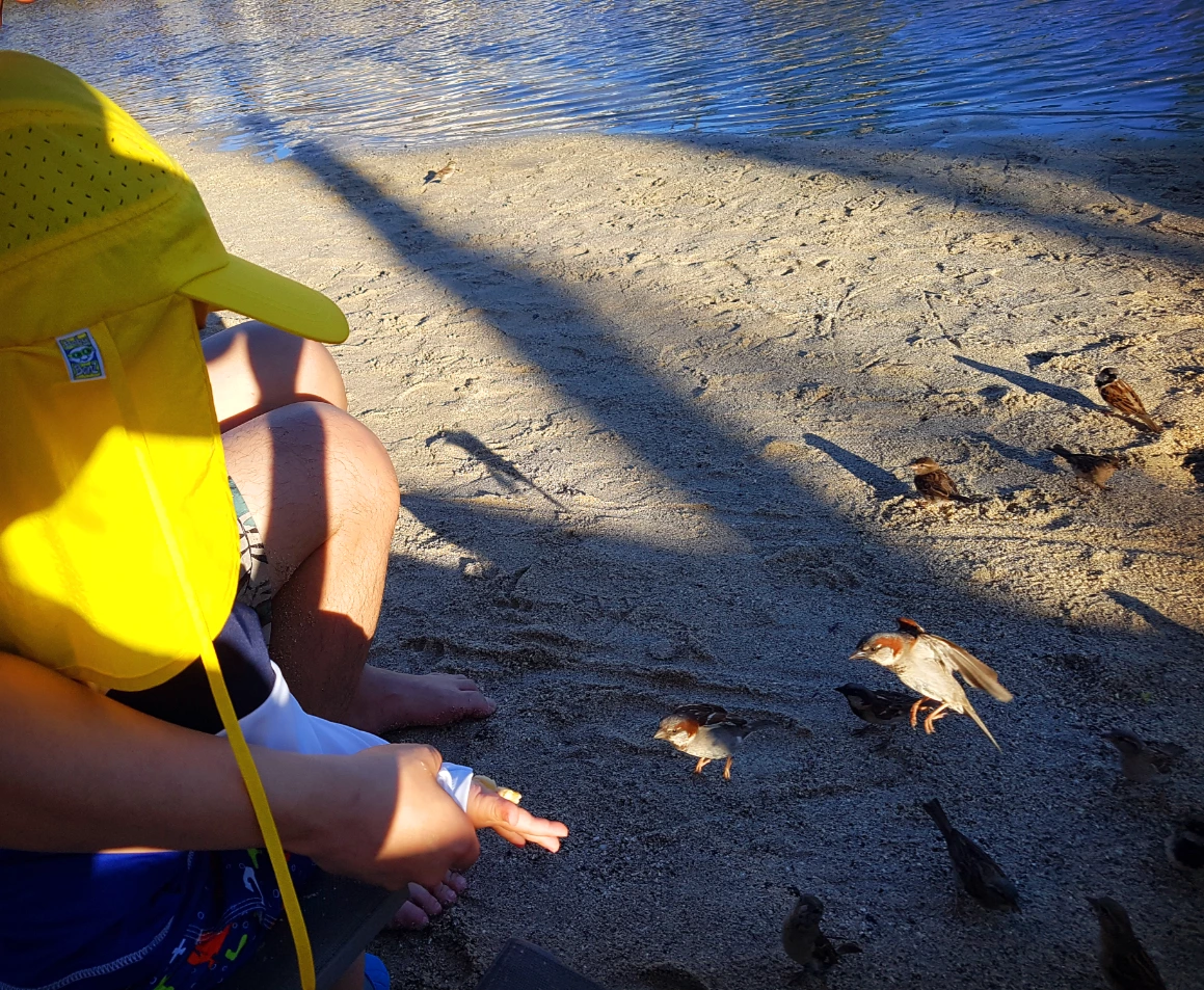 바나나를 먹다가 손 위에 올려두면 동네에선 보지 못하던 예쁜 새들이 날아와 노래 부르며 바나나를 먹는다.