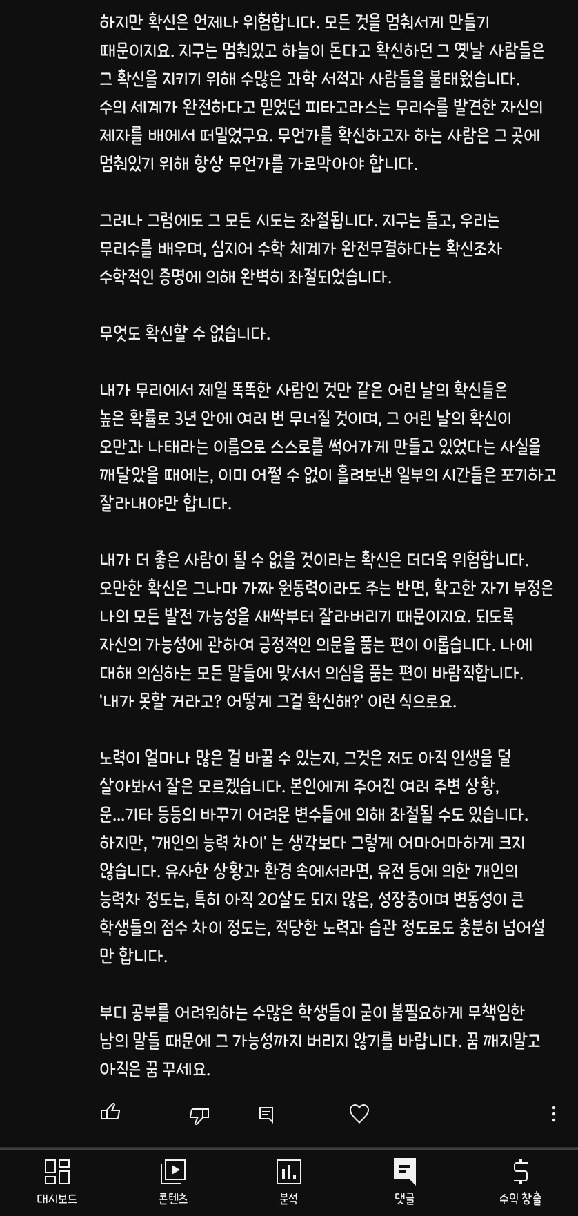 부디 공부를 어려워하는 수많은 학생들이 굳이 불필요하게 무책임한 남의 말들 때문에 그 가능성까지 버리지 않기를 바랍니다. 꿈 깨지말고 아직은 꿈 꾸세요.