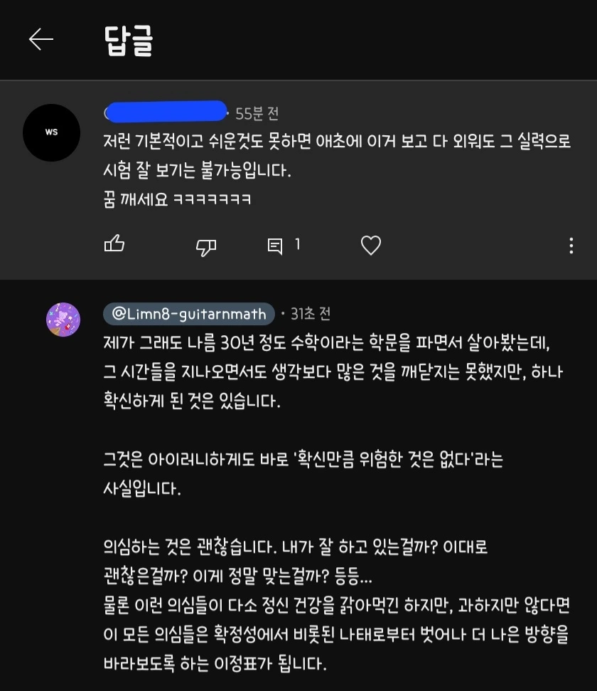 뭐 사실 크게 진지한 뜻을 갖고 단 댓글이 아니긴 하겠지만.....ㅋㅋㅋ 이런 얘기하는 친구들을 볼 때마다 많이 안타까워서 괜히 길게 댓글을 달아봅니다. 마침 수능도 D-100이 깨지기도 했고....ㅎㅎ 아무튼 여러분들 모두 화이팅이고 그 무엇도 확신하지 않기를 바랍니다~