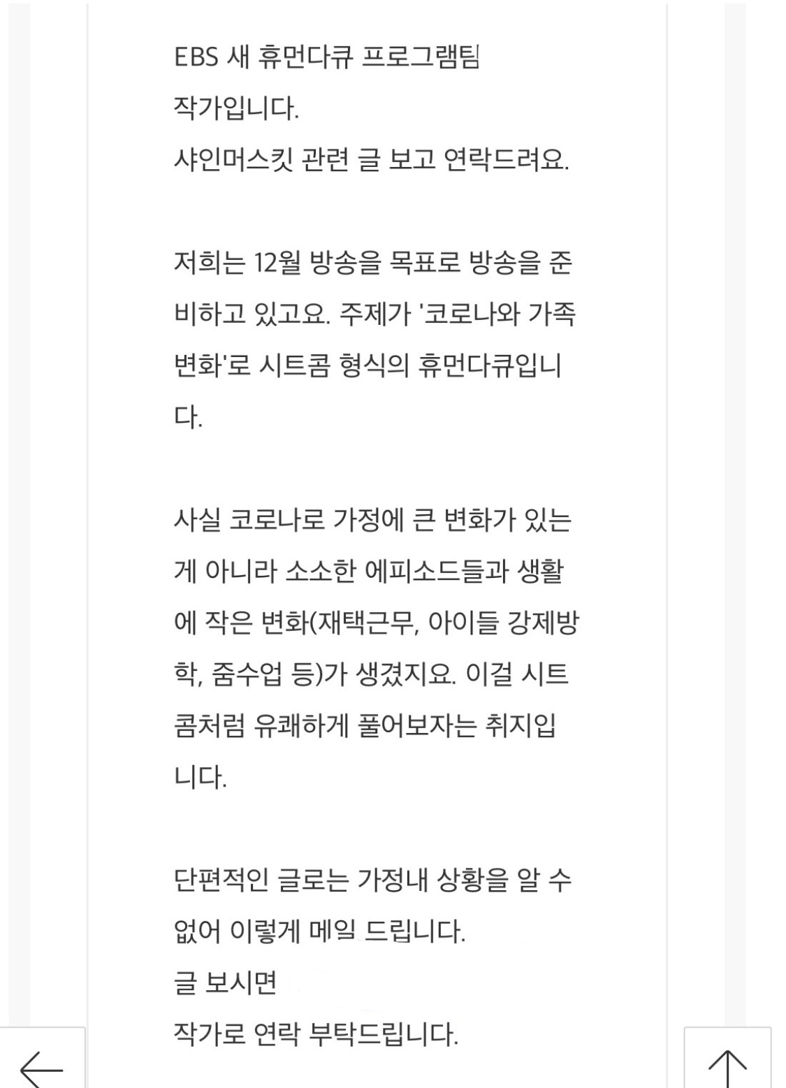 작가님의 메일을 공유하고 우리 가족은 치열한 토론을 벌였다. 방송출연이라는 새로운 경험이냐 개인의 사생활 보장이냐. 4:2 정도로 방송 출연이 우세했으나 한 사람이라도 출연을 거부하면 하지 않는 게 맞다고 판단해 힘들 것 같다고 의사를 전달했다. 약간 두리뭉실하게.
