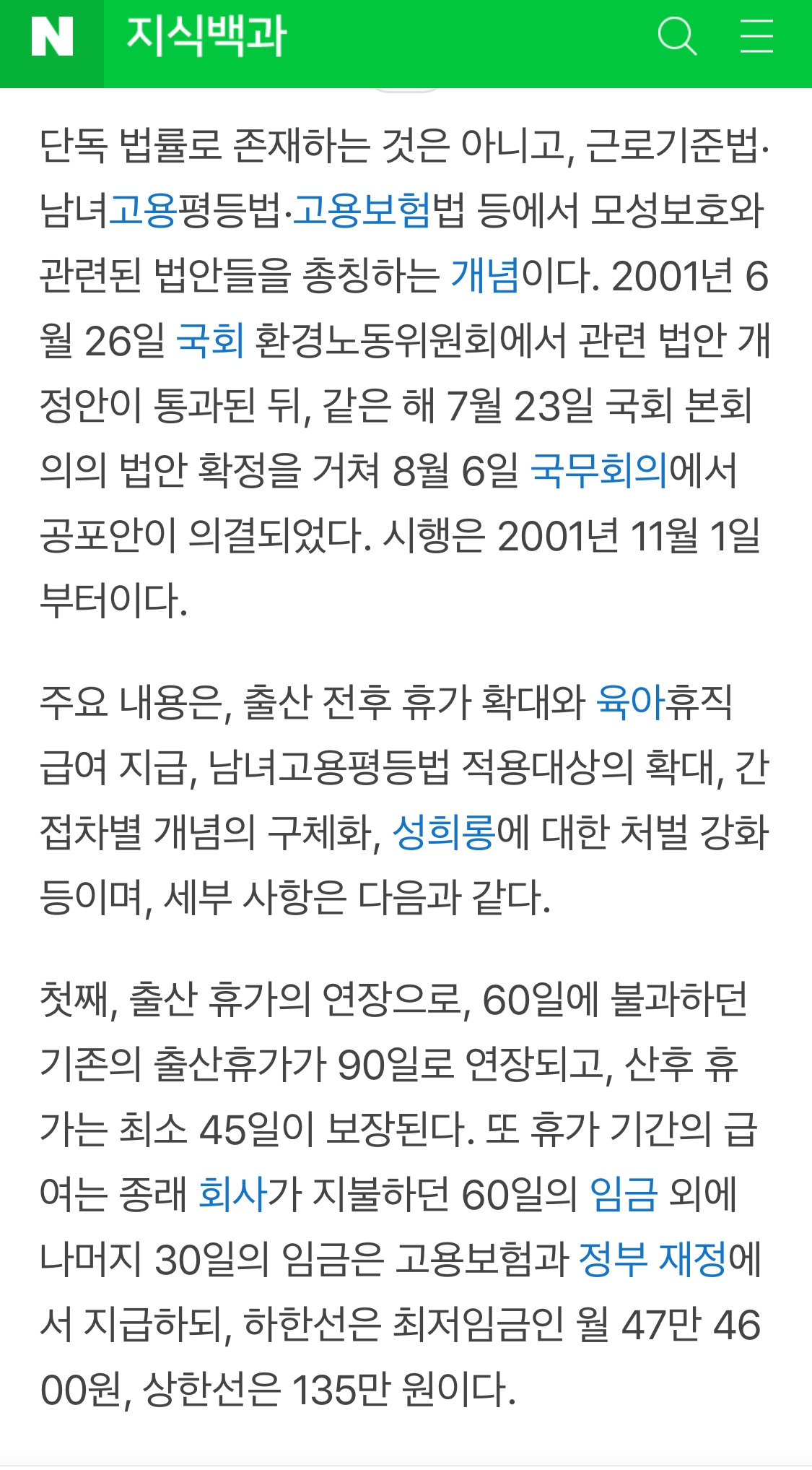 2001년 모성보호법이 만들어졌다. 출산휴가 60일이 90일로 확대되었고 배우자 출산휴가와 육아휴직 제도가 생겼다. 이 법이 생기자 일시적으로 기업에서 여성을 채용하지 않는 현상 일어났지만 지금은 거의 대부분 임신 때문에 회사를 그만두라는 압력을 일어나지 않는다.