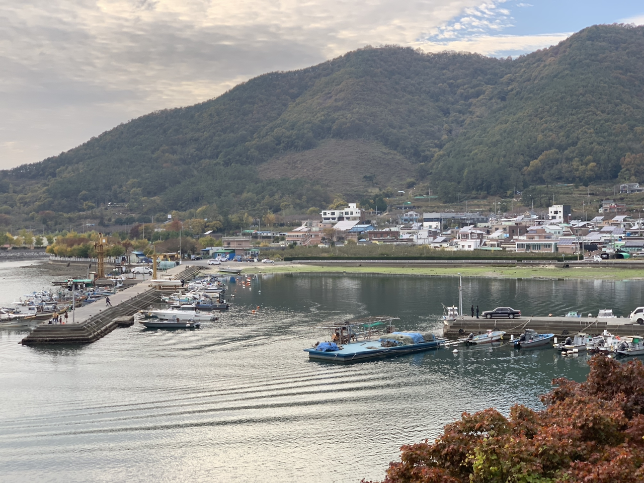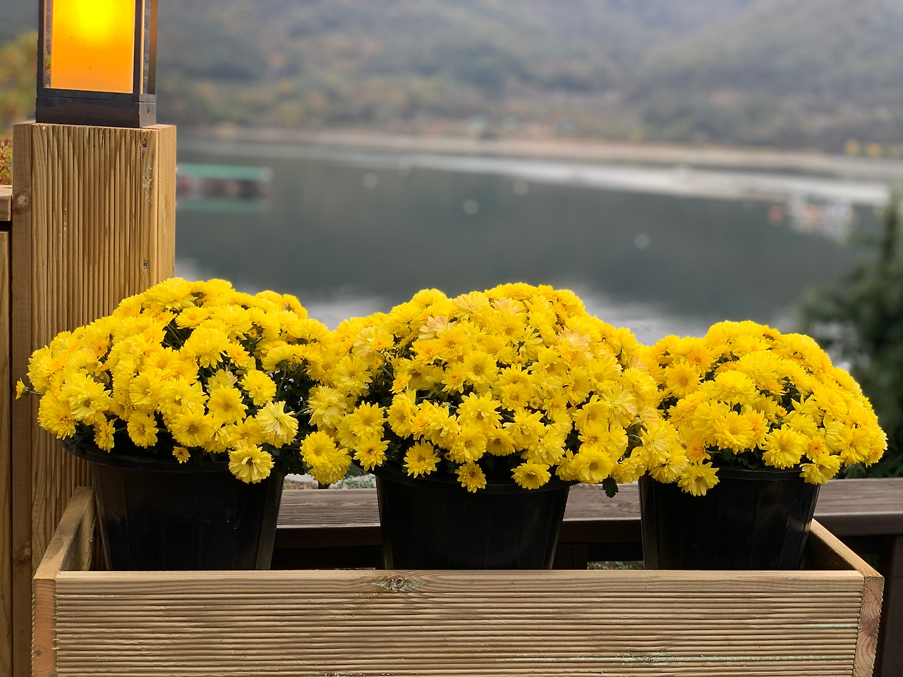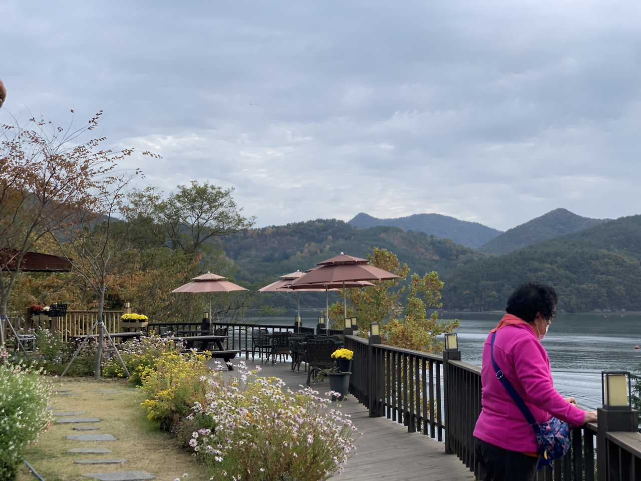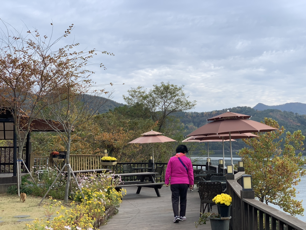 지중해를 나와 가포 덕동 쪽으로 차를 몰았다. 아다지오에 차를 세웠다. 아다지오가 음악 연주할 때 천천히 연주하라는 명령어라고 가르쳐 주니, 아다지오라고 봉여사는 따라 발음했다. 차에서 내리자마자 바로 국화와 바다 풍경을 보느라 정신이 없다. 바다로 산능성이 드리워지는 내가 가장 최애 하는 포인트가 아다지오다.
