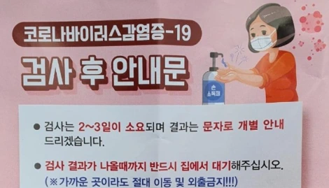 "검사하시면, 예전에는 12시간 안에 나왔는데 지금은 검사가 많이 밀려서 내일 아침에 나올 거예요. 보건소에서 하시면 2~3일 걸리고요. 결과 나올 때까지는 격리하셔야 해요."