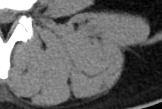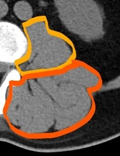 CT상에서 보이는 회색은 근육이고, 검은색은 지방이다. 좌측 사진을 보면 근육 사이사이 검은색 선이 보이는데 지방이다. 물론 사람에서는 그렇고, 소고기에서 이 지방을 마블링이라 한다.