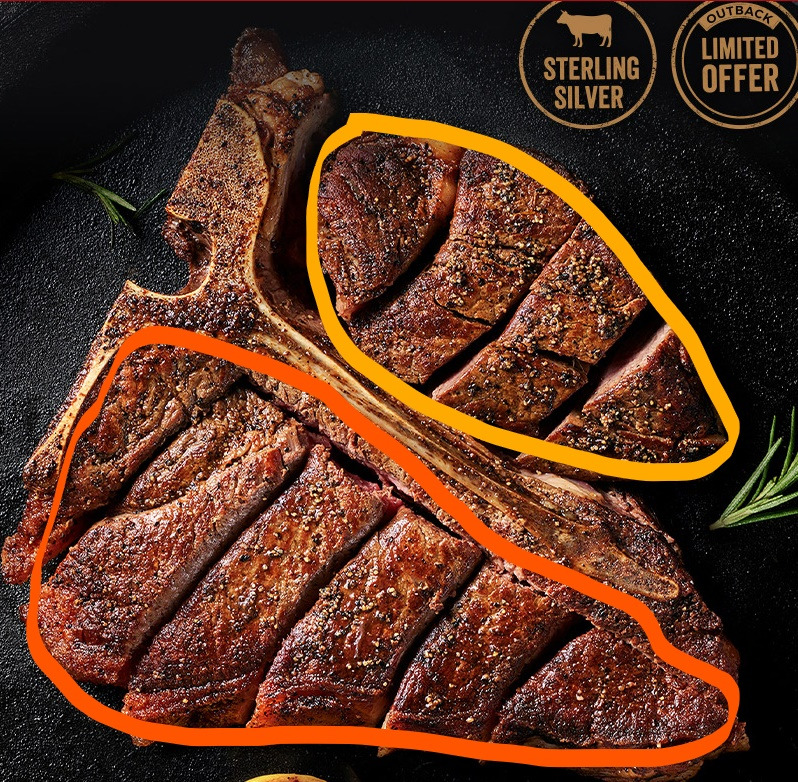 척추를 반으로 절개해 뼈가 T 형태라 T bone 스테이크다. 등심과 안심을 동시에 맛볼 수 있다. 스테이크의 짬짜면이라고 할까? 단, 최소 600g 이상은 돼어야 그럴듯한 티본 스테이크를 맛 볼 수 있으니 먼저 지갑을 두둑히 채워야 한다.