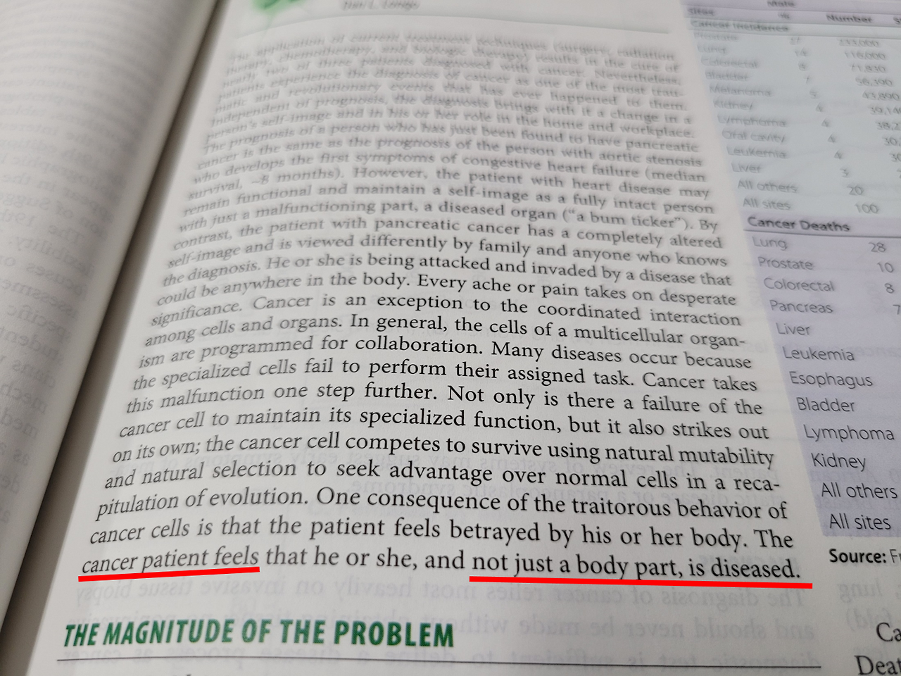 우리 몸 어디서나 문제가 생길 수 있다. 이를 병이라고 한다. 생명체의 가장 기본 단위인 세포이다. 세포가 모여 조직을 이루고, 조직이 모여 기관이 되고, 결국 개체, 즉 사람이 된다. 각각의 세포와 조직, 장기는 분업과 협동을 통해 사람의 생명을 유지한다. 그리고 세포와 장기가 자신이 맡은 일을 제대로 하지 못할 때, 병이 생긴다. 암은 세포와 장기의 상호 작용을 깨뜨린다. 원래 맡았던 역할을 맡지 않을 뿐 아니라, 더 나아가 자신만 혼자 성장해 나간다. 더 정확히는 다른 세포, 다른 조직, 다른 장기마저 무너뜨린다. 이에 사람은 암에 걸리면, 단지 신체 일부가 잘못된 것이 아니라, 자신이 병 그 자체라고 생각한다.
