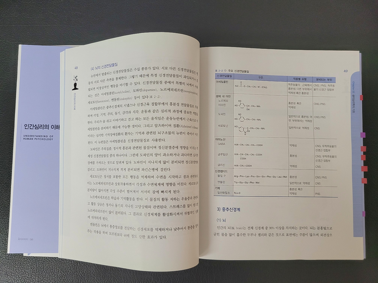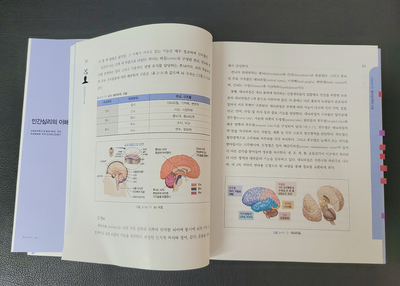 "대학교에서 쓰는 심리학 책이에요. 사람들이 정신 치료하면, 기다란 소파에 누워서 막 상담하고 그럴 것 같죠? 그런 경우도 있지만, 대개는 약물 치료입니다. 왜냐고요? 심리학 책을 보면 아시다시피, 이제는 심리학에서도 우울증 기전이 신경이나 호르몬 문제로 보거든요. 보시면 알다시피 이건 거의 의학 책이잖아요? 특정 물질이 부족해서 우울증이 생기니까, 특정 물질을 보충해주는 거죠. 혈압이 높으면, 약을 써서 낮추고, 낮으면 약을 써서 올리잖아요, 이제 기분도 너무 심하게 붕 뜨면 약을 써서 낮추고, 너무 가라앉으면, 약을 써서 올리는 거죠. 단순히 마음의 문제이니 마음을 강하게 먹어라는 크게 도움이 안 됩니다."