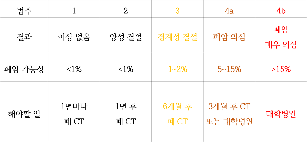 <category 3의 결절. 암일 가능성 1~2%> 60세 김성훈 환자와 상담 중에 나는 이전 결과를 보다 말끝을 흐렸다. 우리나라 사람은 암으로 가장 많이 목숨을 잃는다. 암 중에서는 폐암이 단연코 1위다. 담배를 피워도 안 걸릴 수도 있고, 담배를 안 피워도 걸릴 수 있다. 다만 담배를 하루 한 갑 이상 피우면 폐암에 걸릴 가능성이 대략 20배 이상 증가한다. 그래서 54세 이상 담배를 하루 한 값, 30년 이상 피운 폐암 고위험군 환자를 대상으로 국가 암 검진에 폐 CT가 포함되어 있다.