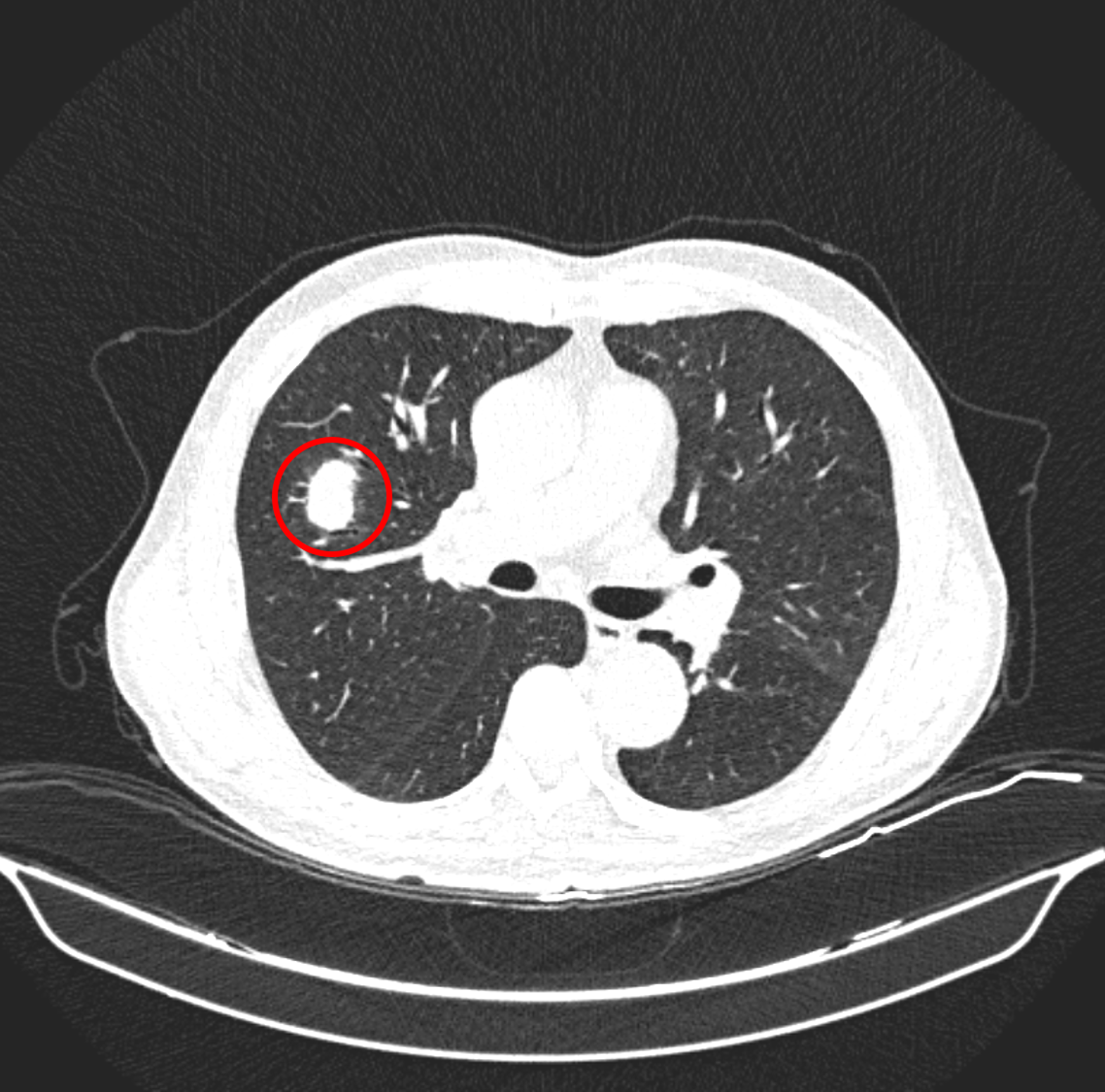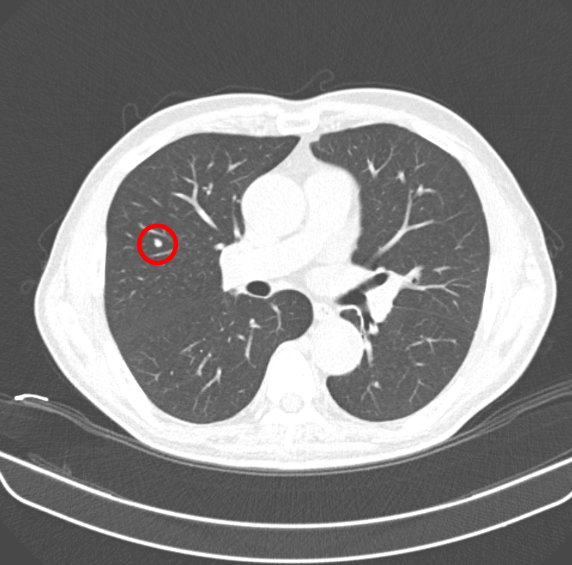 과거 판독 결과에는 CT에는 <6mm nodule, Lung-RADS category 3, 경계성 결절. 폐암일 가능성이 1~2% 있으므로, 6개월 후 폐 CT 추적 관찰>이라고 적혀 있었다. 하지만 환자는 6개월 후에 병원에 오지 않았고, 금연도 하지 않았으며, 2년 만에 왔다.