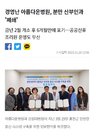 2023년 2월 홍천군에 역시나 보건복지부 ‘분만취역지 산부인과 지원사업’의 지원으로 아름다운 병원이 문을 열었다. 하지만 6개월 만에 운영을 중단했다. 2023년 홍천에서 200명의 출생아가 태어났지만, 아름다운병원을 이용한 아이는 6명이었다.