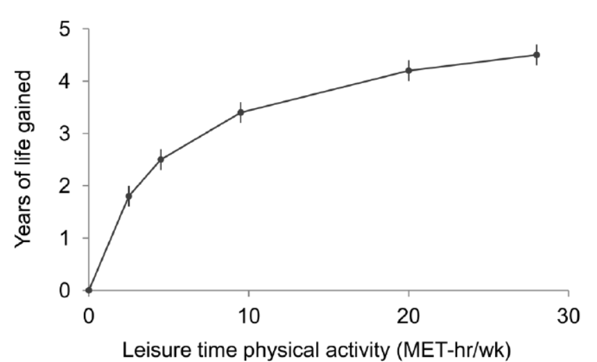Steven C Moore, <Leisure time physical activity of moderate to vigorous intensity and mortality: a large pooled cohort analysis>, PLoS Med, 2012;9(11):e1001335. doi: 10.1371/journal.pmed.1001335. Epub 2012 Nov 6.