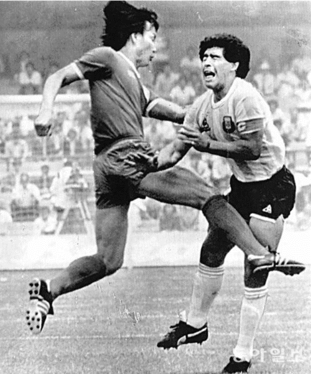 <1986년 멕시코 월드컵 조별리그에서 허정무는 마라도나를 공격하며, '태권 축구'라는 비난을 받았다>