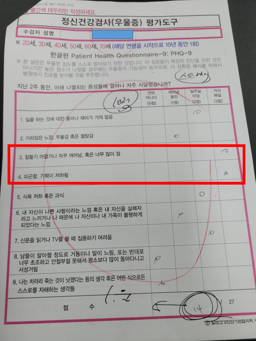 화장도 한 듯, 안 한 듯 평범한 얼굴이었다. 30살의 그녀는 항상 무기력하고, 의욕이 없었으며, 늘 피곤하다고 했다. 가장 간단한 우울증 척도 검사에서 14점으로 우울증이 의심되었다. (10~19: 중간 정도 우울증, 20~: 심한 우울증) 다행히 자살 시도 등은 없었다.