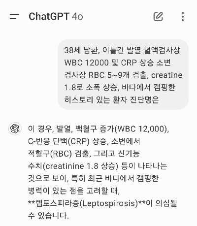 주로 감염된 쥐의 소변 의해 감염되는 렙토스피라증은 쯔쯔가무시와 마찬가지로 신장에 염증을 일으키지만, 한국에서는 쯔쯔가무시보다 훨씬 드물어 가능성이 상대적으로 낮았다. 신증후군인 한타 바이러스도 유사한 증상을 일으키지만, 잠복기가 2~3주로 더 길었다. 아직 인공지능이 의사를 따라오지 못하는 사실에 나름 뿌듯해했다.