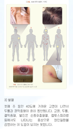 오리엔티아 쯔쯔가무시(Orientia tsutsugamushi)에 감염된 털진드기의 유충이 사람을 물어 생기는 발열과 혈관염을 일으키는 질환이다. 혈액 검사도 있지만 진드기에 물린 상처인 가피(escar)가 진단의 키 포인트이다. 하지만 처음부터 찾기는 어렵고, 몸에 발진이 나타나면 쯔쯔가무시를 의심하고 환자 몸을 뒤져 가피를 찾아 진단을 내린다.