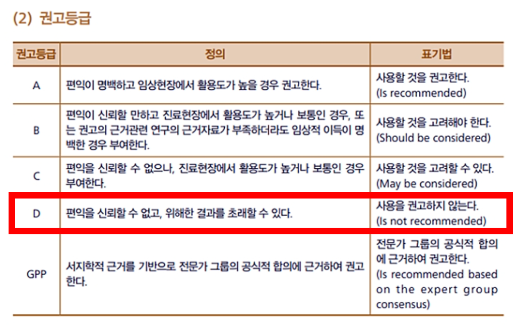 (D 권고 : 아래 그림에서 보듯이 편익을 신뢰할 수 없고, 위해한 결과를 초래할 수 있다는 뜻이다)