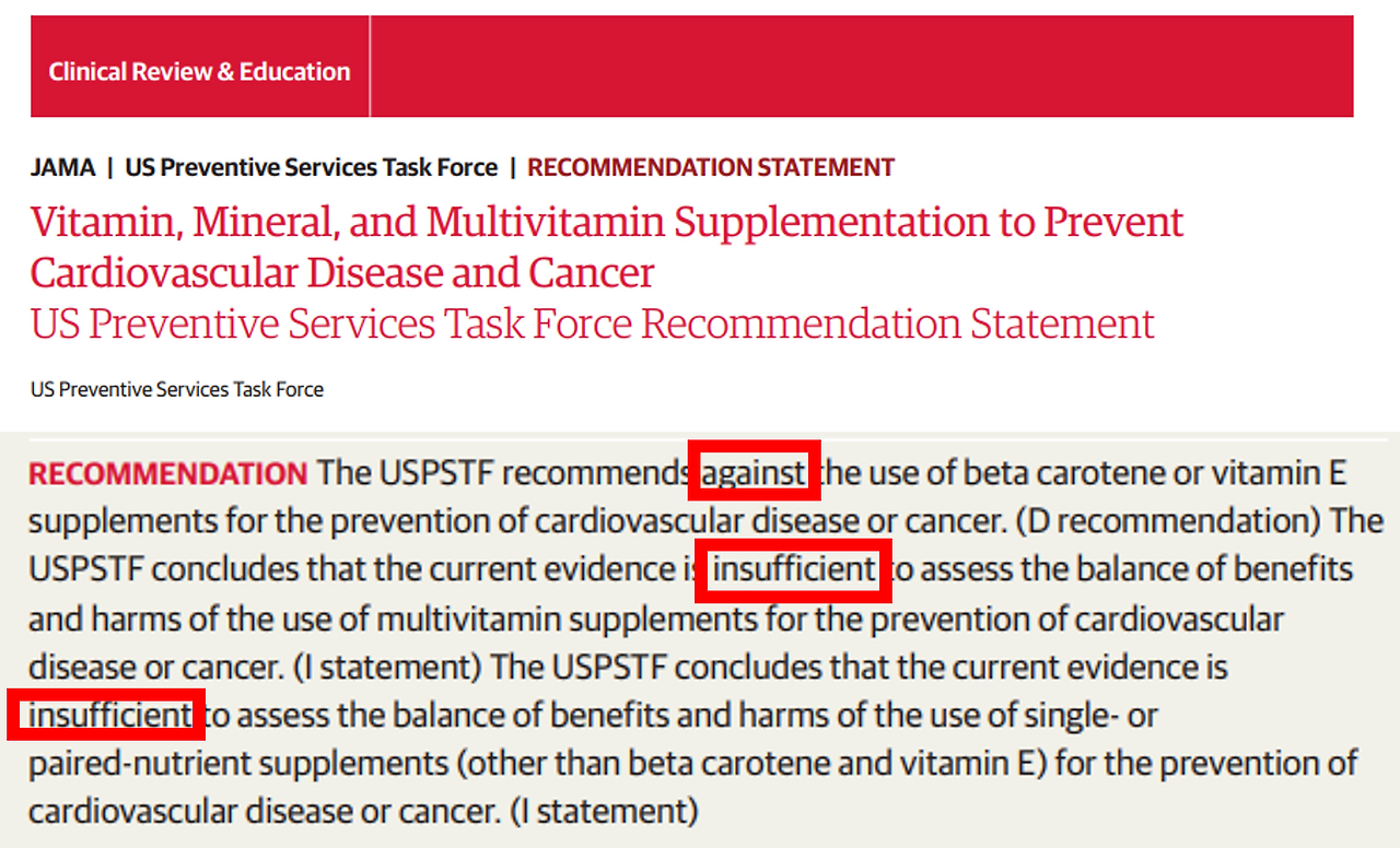 USPSTF는 심혈관 질환이나 암 예방을 위한 종합 비타민 보충제 사용에 대해 이득과 해의 균형을 평가할 수 있는 현재의 근거가 부족하다고 결론지었습니다.