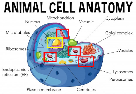 <빨간색: 미토콘드리아, 노란색: 세포핵 (출처: 셔터 스톡)>