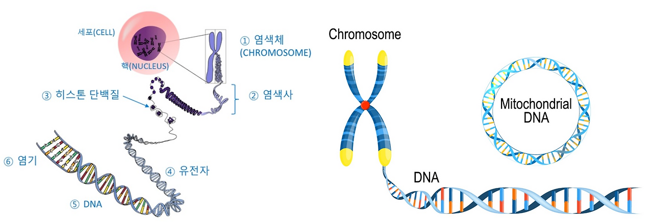 <염색체, DNA, 유전자 개념. 유전 정보를 담고 있는 DNA를 유전자라고 한다.>