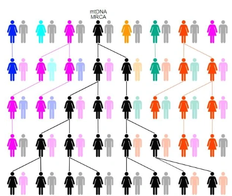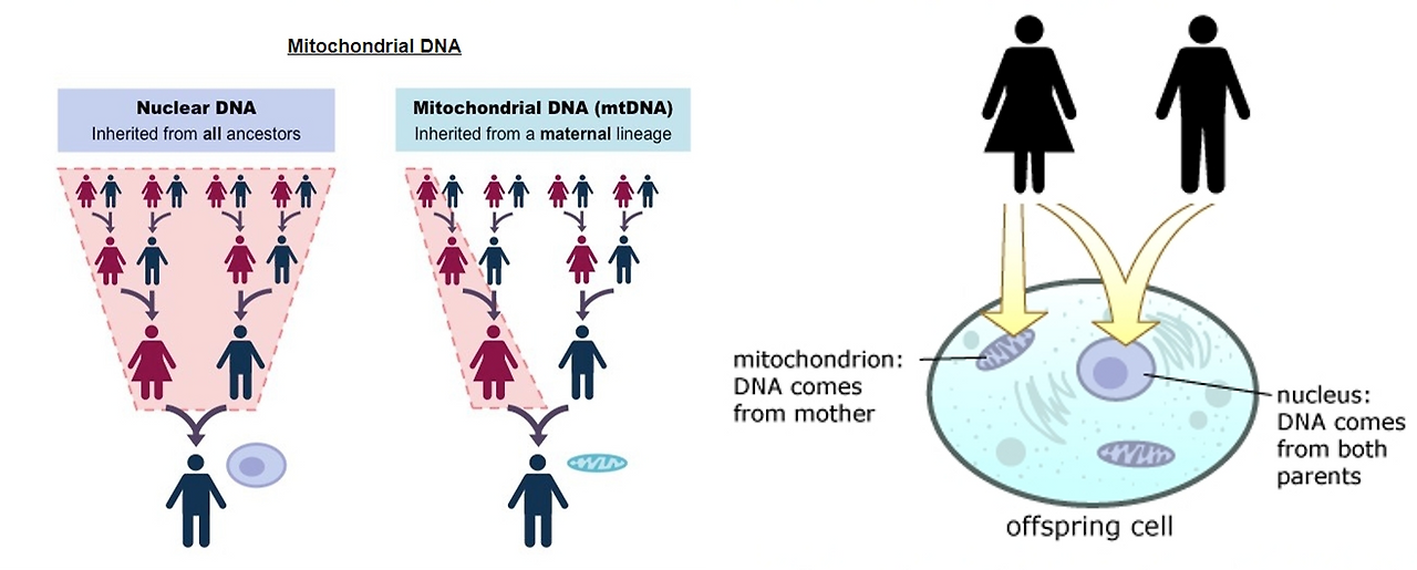 정자와 난자가 만나 수정을 할 때, 남자 쪽 정자는 말 그대로 몸(DNA)만 들어와 살고, 여자 쪽 난자가 집과 살림(세포질 및 미토콘드리아) 모두를 준비한다. 그렇기에 아이 몸에 있는 미토콘드리아는 모두 엄마 것으로, 아빠 것은 하나도 없다. 즉 미토콘드리아는 순수히 모계 유전이다. 그래서 여자의 미토콘드리아만 추적해서 인류의 조상을 찾을 수 있었던 것이었다.