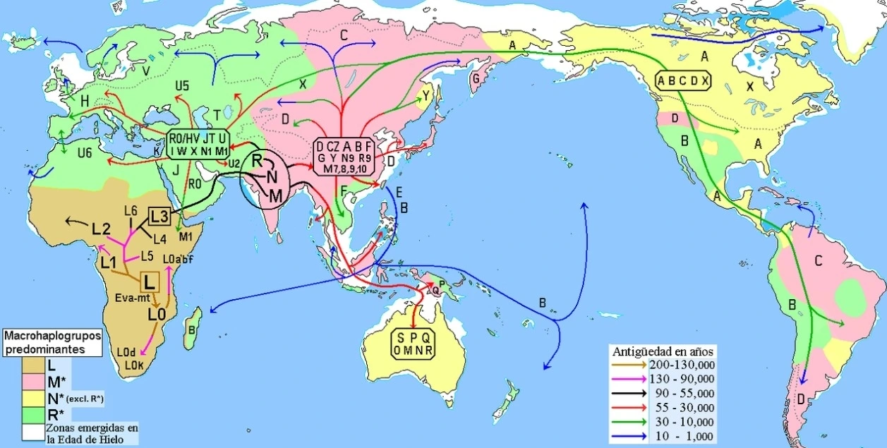 <인류의 조상은 바로 L0로 표시된 아프리카 지역에서 탄생하였다 (출처: 위키백과>>