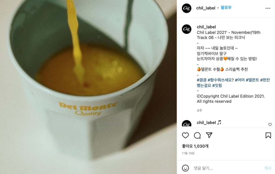 롯데 칠성의 음료 중 하나인 델몬트, 클라우드 등을 오브제로 활용해 앨범 커버 속 사진처럼 찍기도 하고, 칠성 살롱, W컨셉, 29CM, 트렌비, 롯데온 등의 채널을 통해 판매하고 있는 롯데 칠성 관련 굿즈들도 함께 노출하고요. 각 게시글 속 워딩도, 너무 무겁거나 가볍지 않아 부담스럽지 않아요.