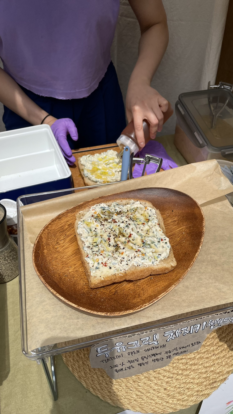 우선 첫번째로 차지키샌드위치는 사실상 아무리 비건버전으로 만들었다고 해도 보장된 소스 맛을 가지고 있습니다. 간 잘 맞춘 비건요거트에 크러시드페퍼 찹찹 뿌려 빵이랑 먹는다..? 몇천년의 역사가 보장하는 맛이에요.