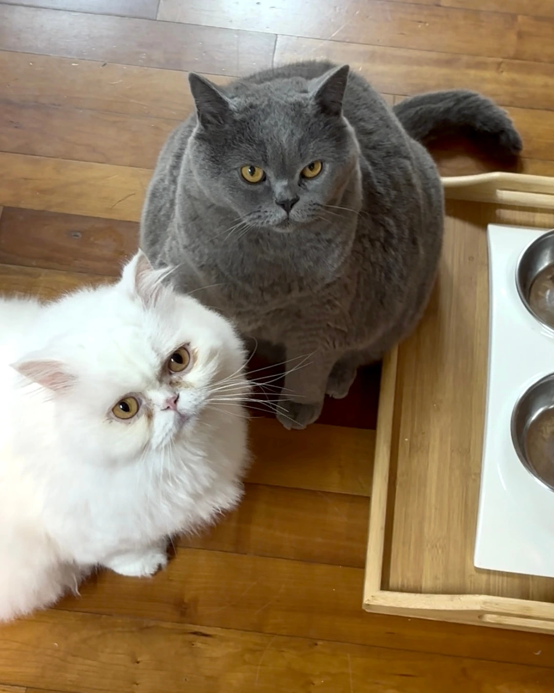 둘이 나란히 밥그릇 앞에 서서 눈빛으로 말을 건넨다.