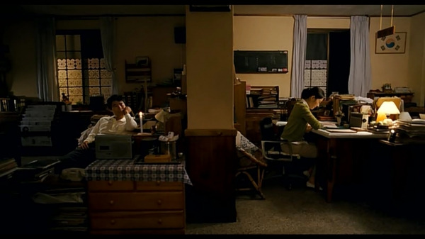 위 사진은 두 인물이 삶을 살아가는 방식, 가치관 등을 미장센으로 훌륭히 형상화한 장면입니다. 어둡고 폐쇄적인 좌측의 공간감과, 밝고 개방적인 우측의 공간감은 강렬한 대비를 이룹니다. 호창과 세영 사이의 벽, 그들의 자세, 그들이 있는 공간의 밝기, 창문의 개폐, 태극기의 유무 등이 바로 이 화면을 장식하는 미장센이자 두 인물의 존재론적 상태를 드러내는 시각적 표현 기법입니다.