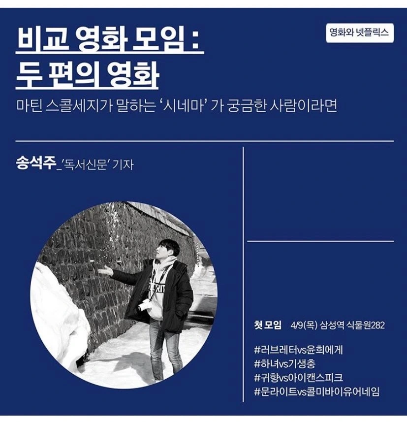 영화를 좋아하는 분들에겐 아마 재미있는 모임이 되지 않을까 싶어요. 제 모임을 선택해주신 분들, 다가오는 봄에 반가운 얼굴로 만나요!