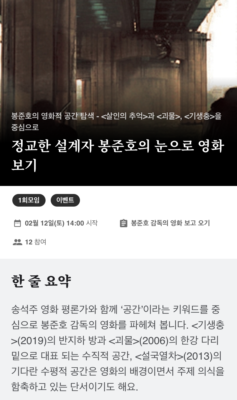 송석주 영화 평론가와 함께 ‘공간’이라는 키워드를 중심으로 봉준호 감독의 영화를 파헤쳐 봅니다. <기생충>(2019)의 반지하 방과 <괴물>(2006)의 한강 다리 밑으로 대표 되는 수직적 공간, <설국