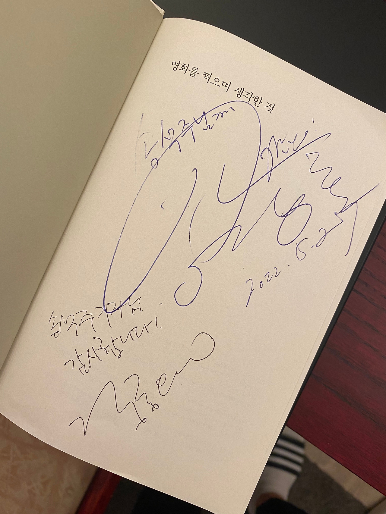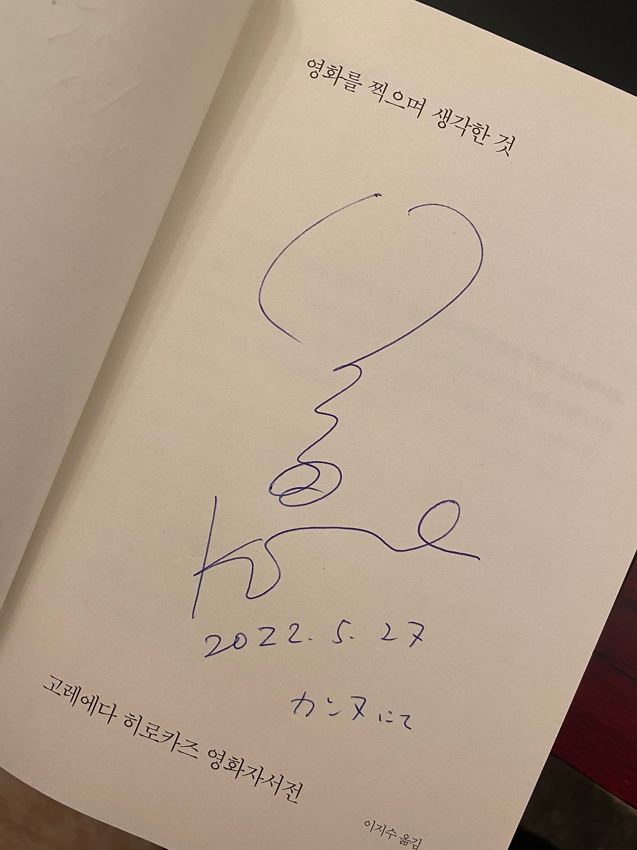 ‘브로커’의 고레에다 감독은 제가 가장 좋아하는 일본의 영화감독입니다. 사인을 받으려고 고레에다 감독의 에세이까지 가져갔는데, 결국 사인을 받았습니다. 올해 칸영화제의 최대(?) 수확이었습니다. 제가 경험한 고레에다 감독은 정말 진중하고, 친절했습니다. 또 박찬욱 감독과 마찬가지로 ‘영화란 무엇인가?’라는 질문에 대한 답변을 늘 마음에 지니고 계신 분 같았어요. 자신만의 영화 철학이 뚜렷했다는 뜻입니다.