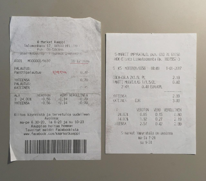 사실 수입이라고 쓰기엔 무척 소소하긴 하지만, 핀란드에서 빈 병을 슈퍼마켓에 팔아 돈을 벌 수 있다. 핀란드에서 판매되는 모든 음료수 병과 캔에는 보증금이 붙어있다. 콜라 1병을 사면 콜라 값에 병 보증금까지 지불하고, 나중에 슈퍼마켓에 병을 되팔면 보증금을 돌려받는 식이다. 병마다 보증금 가격이 조금씩 다른데, 작은 알루미늄 캔 0.15유로, 1.5L짜리 플라스틱병은 0.40유로이다. 0.40유로를 우리나라 돈으로 하면 500원 정도인 셈이니, 그냥 버리리기엔 아깝다고 생각했다. 그래서 나도 빈 병을 잘 모아두었다가 슈퍼마켓에 되팔곤 했다. 큰돈은 아니었지만 학생인 나에게 꽤나 쏠쏠한 금액이었다.
